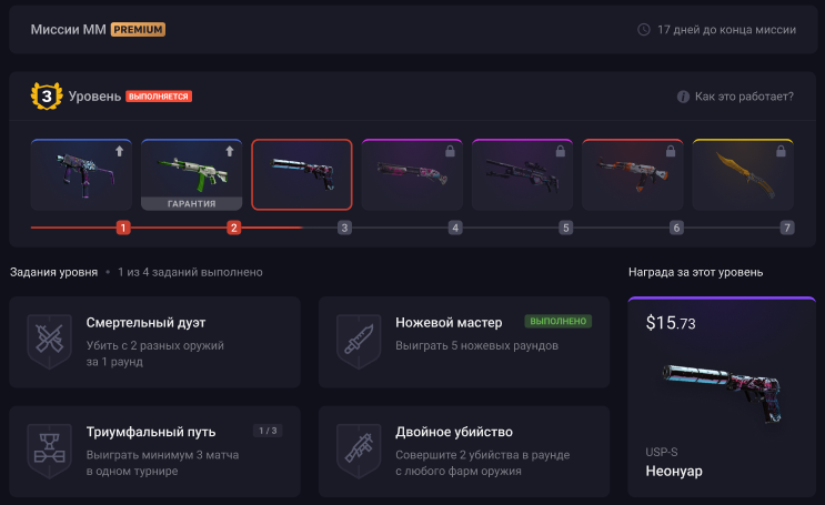 Помимо ММ в CS2, мы также официально запускаем миссии. Этот контент станет доступен нашим премиум игрокам в ближайшие дни. Ваша задача пройти с 1 по 7 уровень, выполняя различные задания, по ходу прохождения улучшая ваш текущий скин на более ценный.